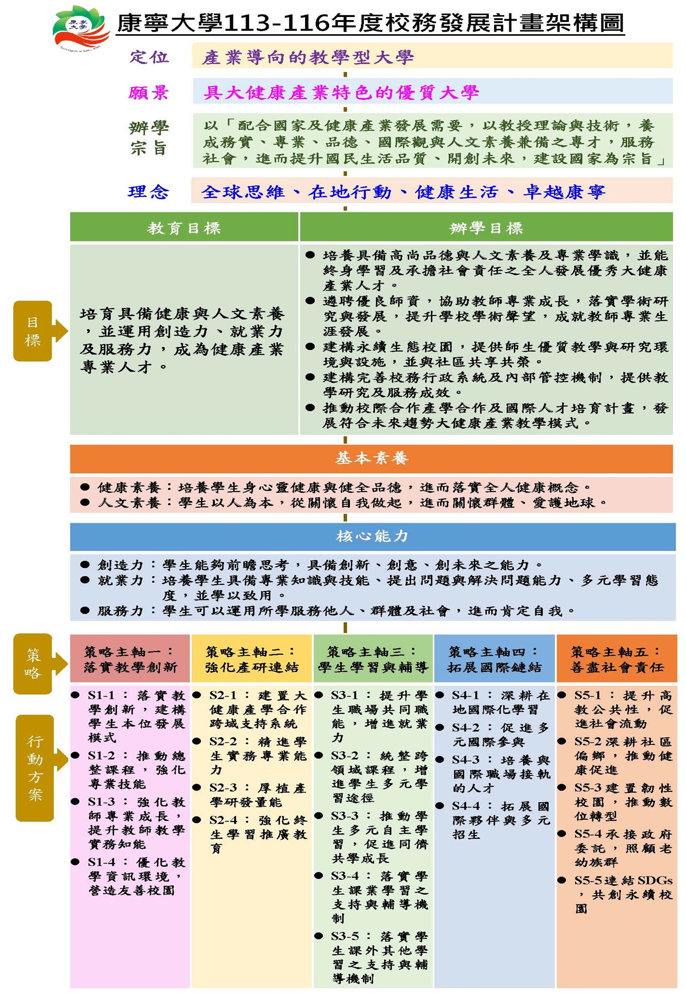 113-116年度本校定位為「產業導向的教學型大學」,發展願景為「具大健康產業特色的優質大學」,本期程主要有五項策略主軸,分別為1.落實教學創新;2.強化產研連結;3.學生學習與輔導;4.拓展國際鏈結;5.善盡社會責任。本校校務發展計畫架構圖,如下圖。