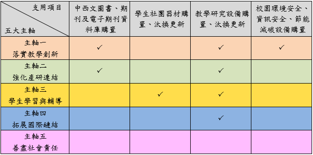 透過主軸五的善盡社會責任,本校在行政與學術團隊持續秉諸本校辦學理念與教育使命下,提供學生均等就學機會及協助經濟及文化不利學生安心就讀;深入社區偏鄉,照顧老幼族群,維護社會正義,促進和平多元社會。 此外結合聯合國永續發展目標(SDGs)融入教學、研究及學校中長程發展計畫中,持續推動大學社會責任與永續發展之各項教育措施,具體達到善盡大學社會責任及永續校園之目標。