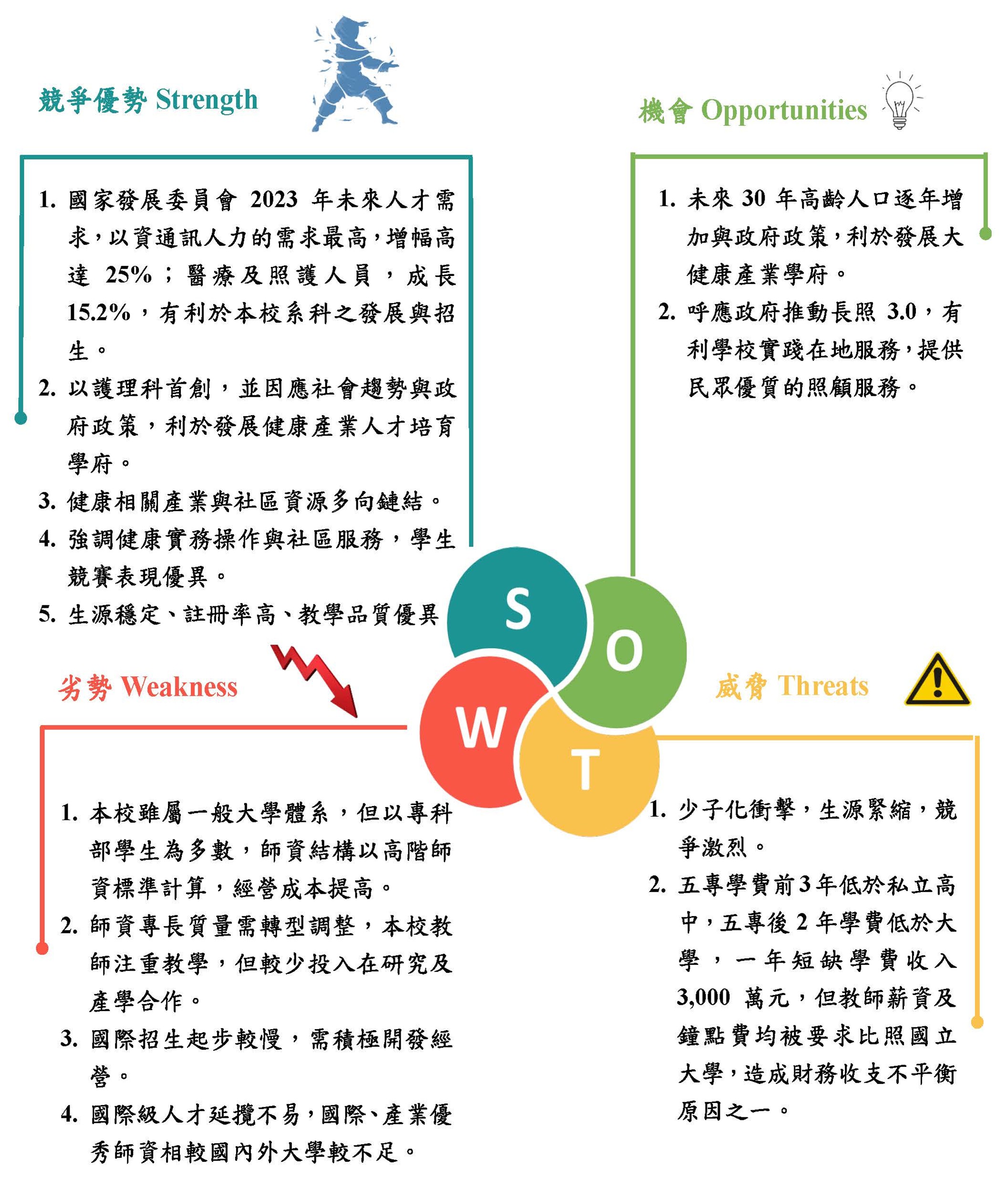 未來校務發展將擴大本校優勢,對於劣勢及威脅將透過校務發展規劃與執行轉化為機會,降低不利之影響,期盼將劣勢及威脅轉化為優勢,使學校校務發展更具競爭力。結合TOWS矩陣的配對工具導出四種組合策略,提出據此交叉發展相應的具體目標策略。